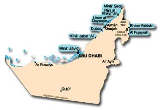 Formal Name: United Arab Emirates (Al Imarat al Arabiyah al Muttahidah) ةﺪﺤّﺘﻤﻟا ﺔّﻴﺑﺮﻌﻟا تارﺎﻣﻹا. The seven emirates, in order of size, are: Abu Dhabi (Abu Zaby) ﻲﺒﻇ ﻮﺑأ , Dubai (Dubayy) ّﻲﺑد, Sharjah (Ash Shariqah) ﺔﻗرﺎﺸﻟا, Umm al Qaywayn ﻦﻳﻮﻴﻘﻟا ّمأ, Ajman نﺎﻤﺠﻋ, Al Fajayrah ةﺮﻴﺠﻔﻟا, and Ras al Khaymah ﺔﻤﻴﺨﻟا سأر.